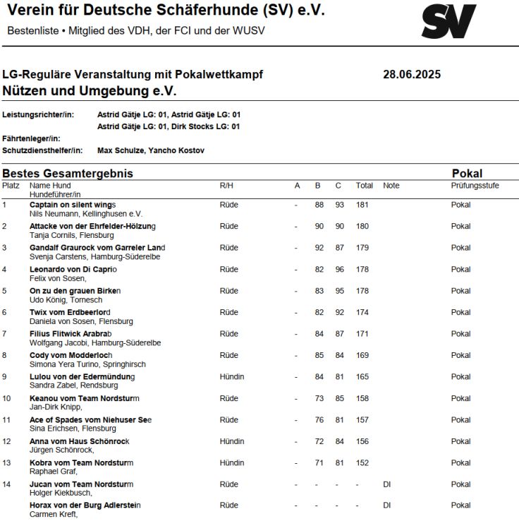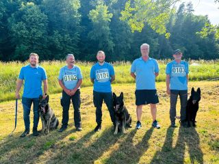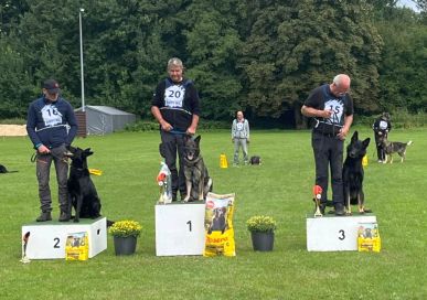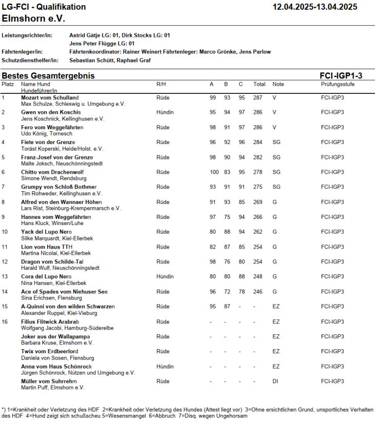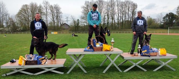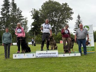Da Jens-Peter Flügge als Richter in der Unterordnung auf der BSP fungierte, wurde ich vom LG-Vorstand als Mannschaftsführer eingesetzt. Für das entgegengebrachte Vertrauen bedanke ich mich. Die BSP war von der Landesgruppe Sachsen hervorragend organisiert. Auch die Speisen und Getränke im Stadion wurden zu angemessenen Preisen angeboten. Da bei der Mannschaftsführerbesprechung am Donnerstag sechs Teilnehmer als nicht anwesend gemeldet wurden, hatte Simone Wendt das Glück, hinzugelost zu werden. Damit konnte die LG mit sieben Teilnehmern starten. Obwohl sich die Auslosung sehr in die Länge zog, war der Einmarsch der Mannschaften mit selbst ausgewählter Musik ausgesprochen stimmungsvoll. Da ich es als Mannschaftsführer wegen möglicher Proteste enorm wichtig finde, im Fährtengelände vor Ort zu sein, begleitete ich jedes einzelne Team in der Abteilung „A“. Infolgedessen konnte ich leider viele Vorführungen unserer Teilnehmer in der Unterordnung und im Schutzdienst im Stadion nicht sehen. Beim Fährtengelände handelte es sich um Acker mit teilweise Bewuchs. Die Herausforderung für die Hunde ergab sich aus dem wechselhaften Wetter und dem starken Wind. In diesem Jahr konnten alle unsere Landesgruppenteilnehmer bestehen. Max erreichte mit seinem Mozart vom Schulland als erfolgreichster Teilnehmer unserer LG einen hervorragenden 16. Platz mit 281 Punkten. Mit nur einem Punkt weniger belegte Toräst mit Fiete von der Grenze ebenfalls einen sehr guten 20. Platz. Ich möchte mich bei allen LG-Teilnehmern für die angenehme Zusammenarbeit und das harmonische Miteinander bedanken. Ein besonderer Dank geht auch an Tanja Cornils mit ihrer Firma „ www.ferienhaeuser.biz “, die alle Teilnehmer mit qualitativ hochwertiger und sehr schöner Mannschaftsbekleidung ausgestattet hat. Bernhard Flinks, stellv. LG-ABW Die Ergebnisliste HIER Hier einige Fotos unserer LG1-Teilnehmer |