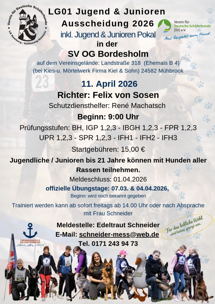 ![]() Einladung in der OG Bordesholm Liebe Jugendliche und Junioren, wie in nachfolgender Anzeige bereits ausgewiesen, veranstalten wir 2 offizielle Trainingstage zur J&J-Ausscheidung. Der erste Termin am kommenden Samstag, den 07.03.26. Wir beginnen mit dem Training um 10:30 Uhr. Unser LG-Lehrhelfer Rene Machatsch wird ab Mittag vor Ort sein. Wir freuen uns auf eure Teilnahme. Liebe Grüße Daniela von Sosen - LG-Jugendwartin ![]() Seitenanfang |